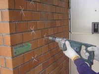 タイル壁面がコンクリートから浮いている場合は、エポキシ樹脂注入とステンレス製アンカーピンを併用し、剥落を防止します。